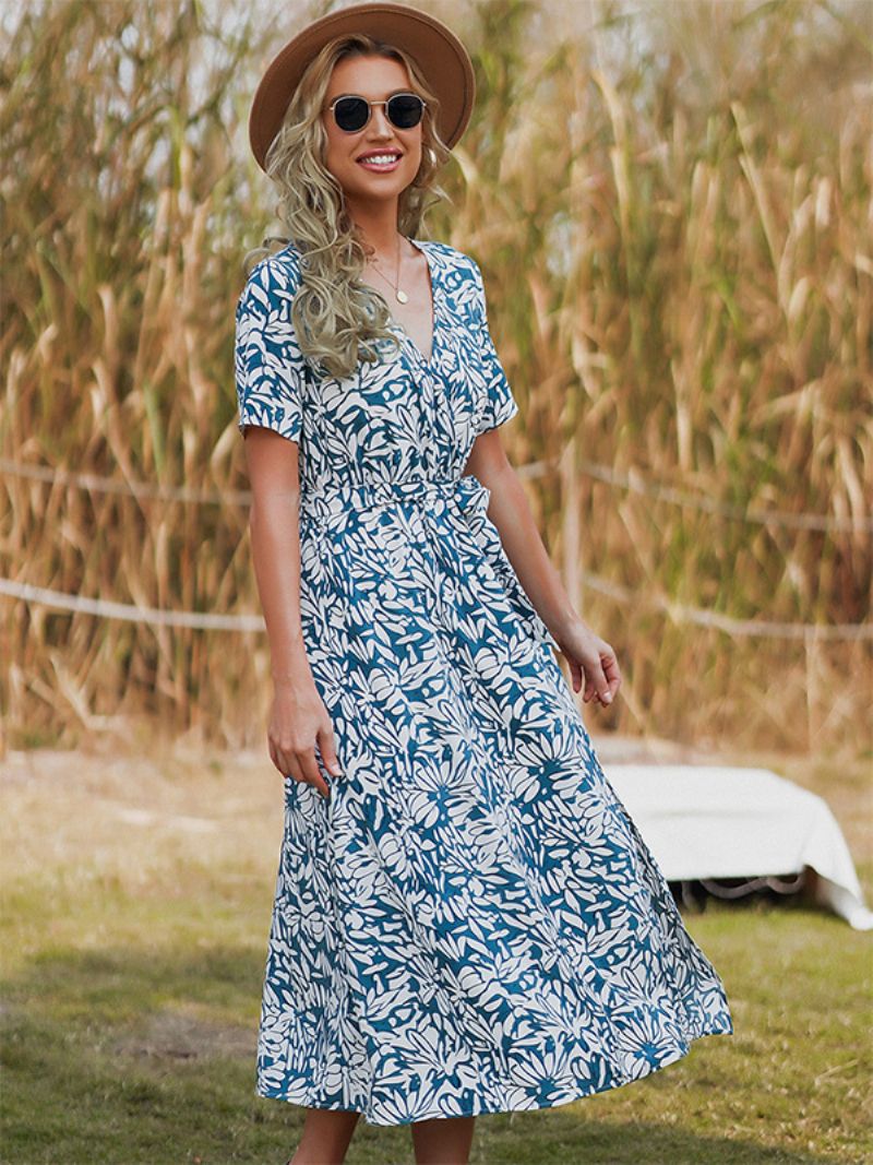 Blommig Klänning För Kvinnor Med Tryckt Skärp V-ringad Kort Ärm Chic Våren Midiklänningar
