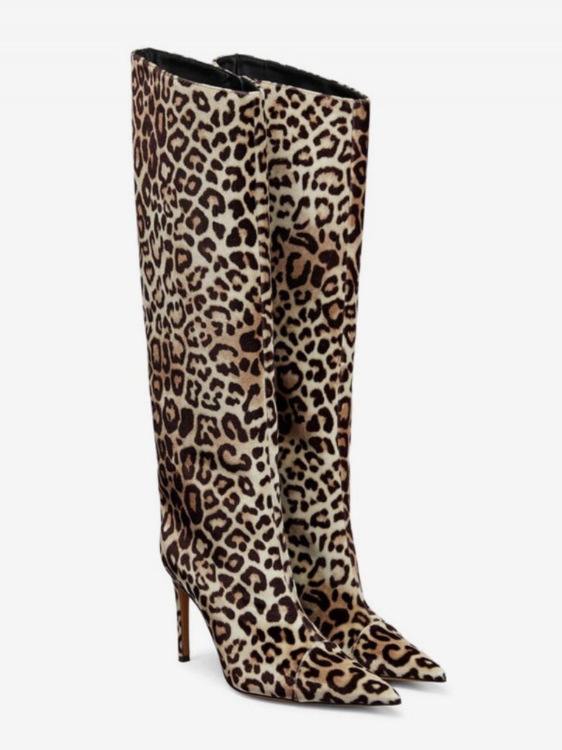 Dammocka Med Breda Kalvstövlar Leopard Högklackade Knähöga Stövlar