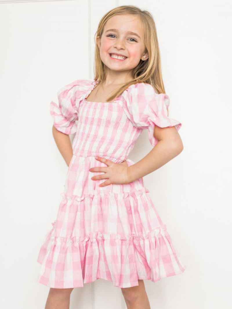 Kvinnors Barbie Rosa Gingham Klänning Förälder-barn Fyrkantig Hals Pläd Medium Sommarklänning