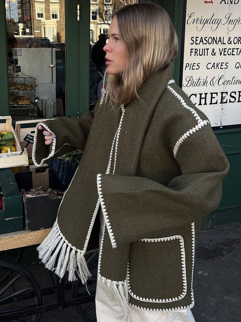 Kvinnors Broderad Jacka Enkelbröst Lösa Ytterkläder Med Halsduk