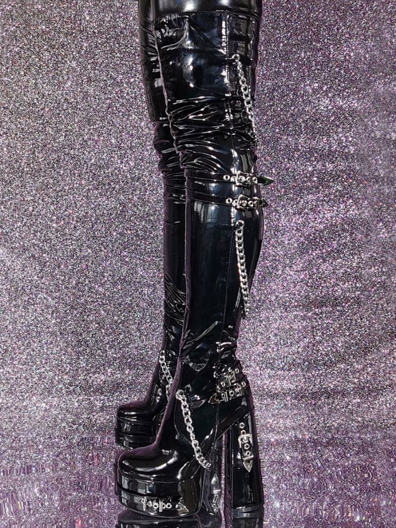 Kvinnors Svarta Lår Höga Stövlar Plattform Chunky Hälkedja Detalj Över Knä Gotiska