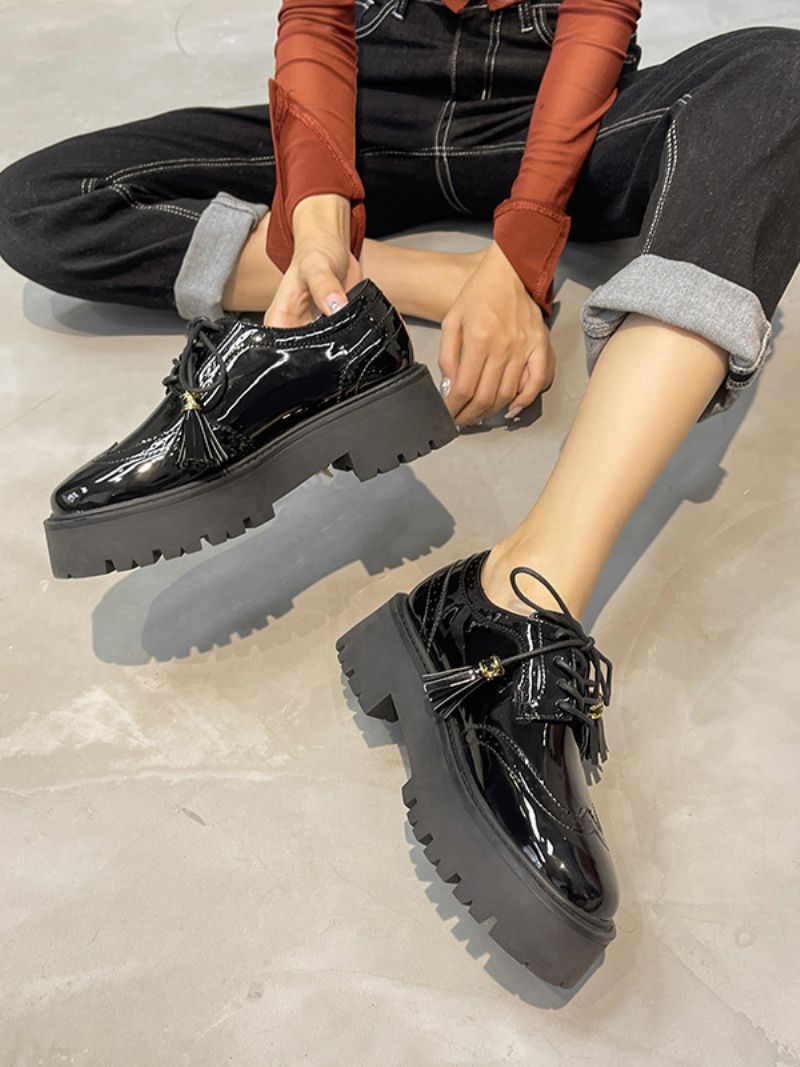 Kvinnors Svarta Oxfords Flatform Rund Toe Snöra Vardagsskor