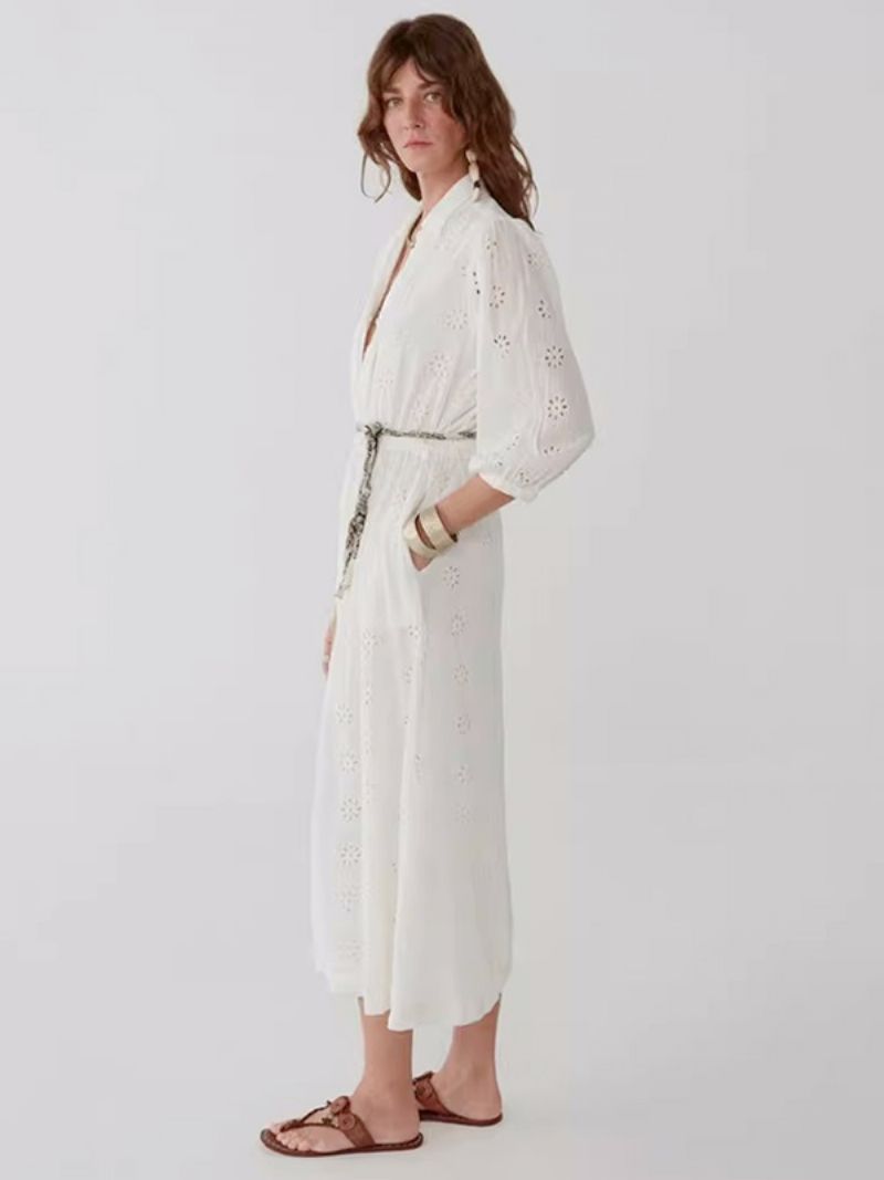 Kvinnors Vita Eleganta Boho-klänning Bottom Up Bältade Ihåliga Sommarklänningar