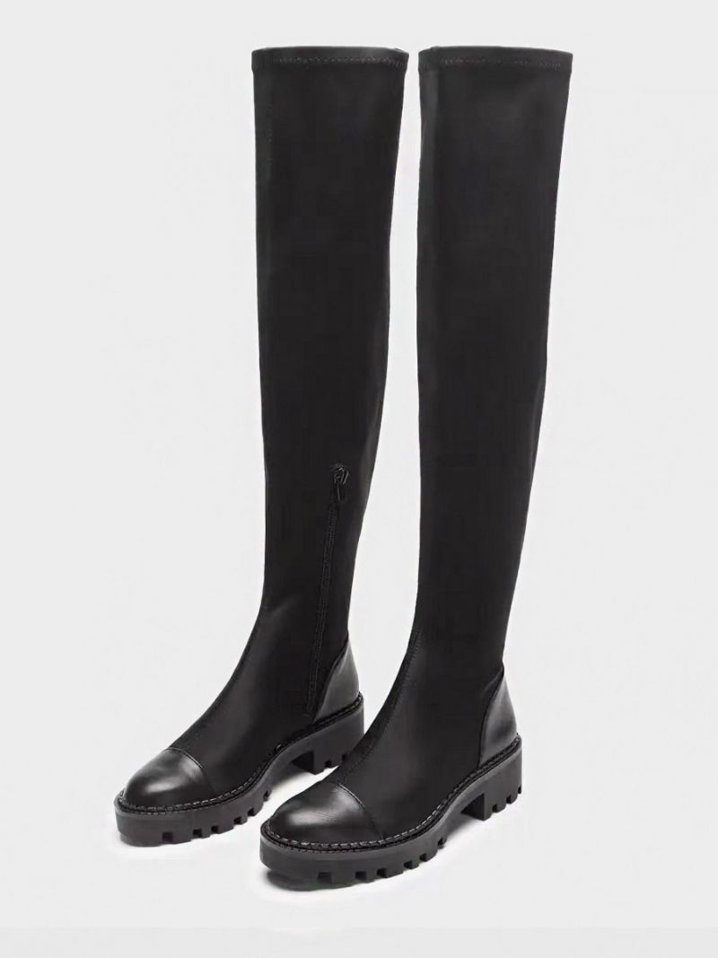 Svarta Elastiska Stövlar Dam Patchwork Flat Över Knä
