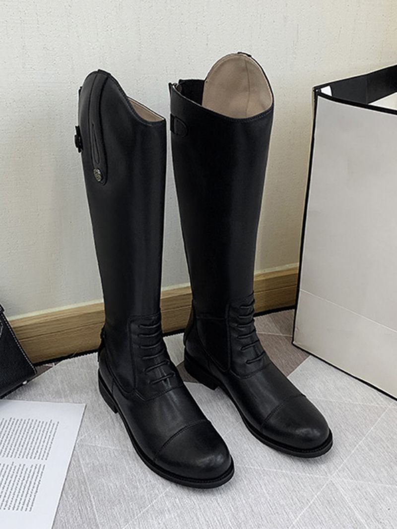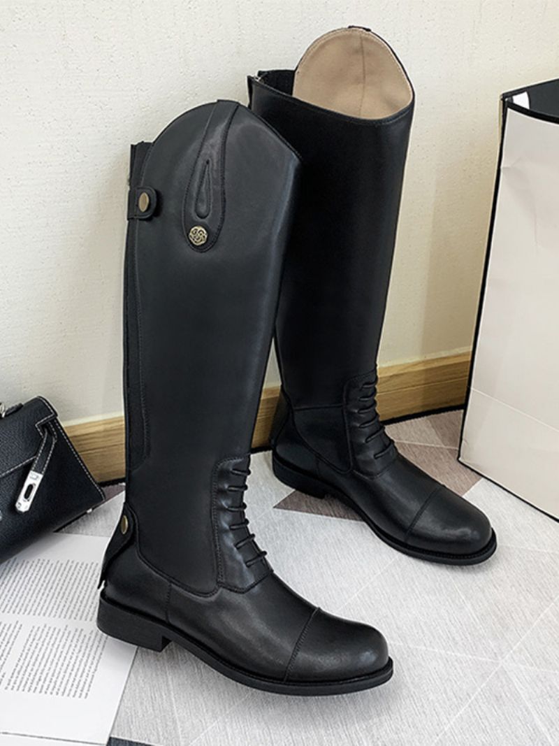 Svarta Ridstövlar För Kvinnor Rund Tå Platta Stövlar Mitten Av Kalven